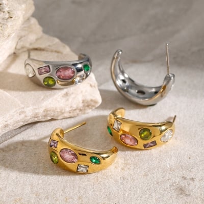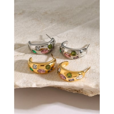 18K Gold Plated Stainless Steel C-Shape Earrings - Colorful Zircon Inlaid Fashion Jewelry